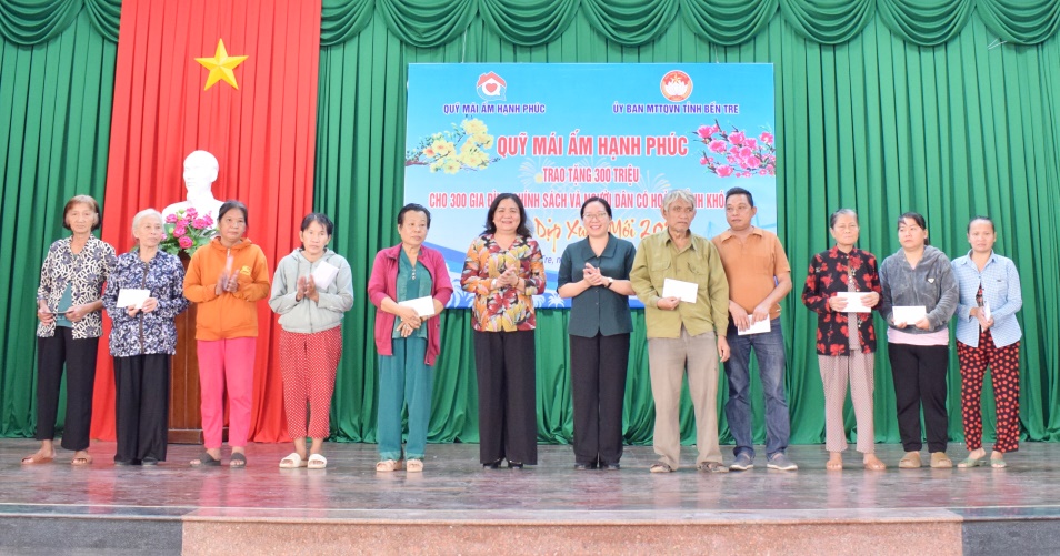 Hưởng ứng phong trào “Cả nước chung tay vì người nghèo, không để ai bị bỏ lại phía sau”, phong trào thi đua “Đồng khởi mới” toàn diện trên tất cả các lĩnh vực. Trong dịp Tết, cấp ủy, chính quyền, MTTQ Việt Nam, các ngành, các cấp tỉnh Bến Tre tổ chức vận động và trích từ Ngân sách Nhà nước, cùng với sự chung tay góp sức, chia sẻ của các tổ chức, cá nhân, doanh nghiệp trong và ngoài tỉnh đã giúp đỡ, hỗ trợ, tặng quà đến các hộ gia đình chính sách khó khăn, Mẹ Việt Nam anh hùng, các đối tượng bảo trợ xã hội, hộ nghèo, cận nghèo đón một mùa Xuân đầy đủ, đầm ấm hơn.