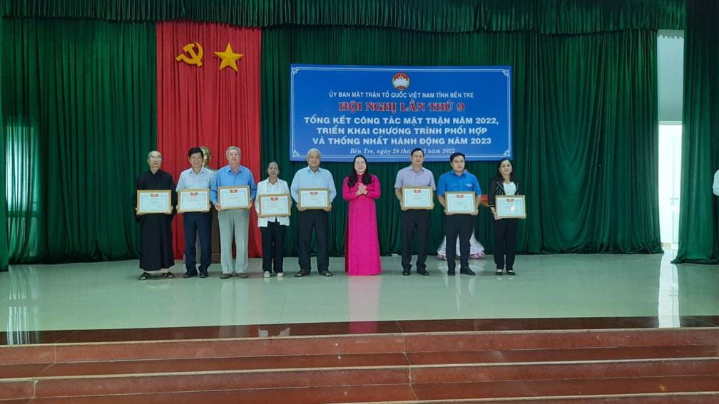 Với những kết quả đạt được nêu trên, năm 2022 MTTQ Việt Nam tỉnh Bến Tre được Ban Thường trực Ủy ban Trung ương MTTQ Việt Nam đánh giá hoàn thành xuất sắc nhiệm vụ, Ủy ban Trung ương MTTQ Việt Nam tặng Bằng khen cho 14 tập thể và 11 cá nhân; Ủy ban MTTQ Việt Nam tỉnh tặng Bằng khen cho 170 tập thể và 271 cá nhân.