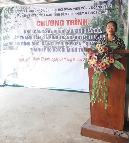 Thay mặt Ban Chấp hành công đoàn cơ sở Ủy ban MTTQ Việt Nam tỉnh bà Nguyễn Thị Mai Rý đã cảm ơn nhà tài trợ đã ủng hộ kinh phí để xây dựng mới cầu Kinh Đất Đỏ đồng thời cũng chúc mừng bà con ấp Thạnh Tân sớm có cây cầu mới giúp bà con dễ dàng giao thương hàng hóa trong thời gian tới và mong rằng địa phương thực hiện tốt công tác giám sát trong quá trình thi công, cũng như sau khi hoàn công sẽ thực hiện thường xuyên việc duy tu, bảo dưỡng để công trình cầu đạt chất lượng và phục vụ bà con được lâu bền.