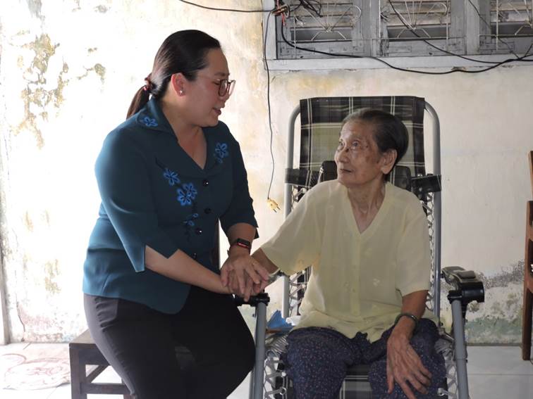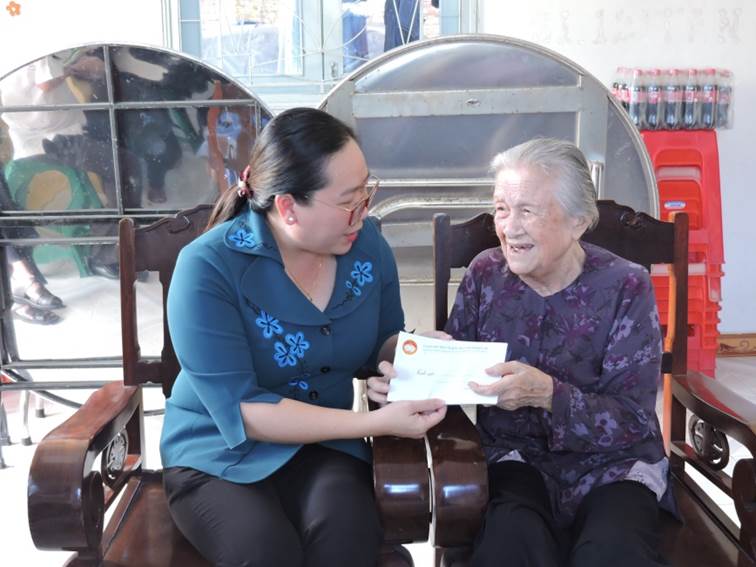 Bà Nguyễn Thị Hồng Nhung, Chủ tịch Ủy ban MTTQ Việt Nam tỉnh thăm, chúc mừng bà Nguyễn Thị Khao - Nguyên PCT Ủy ban MTTQ Việt Nam tỉnh