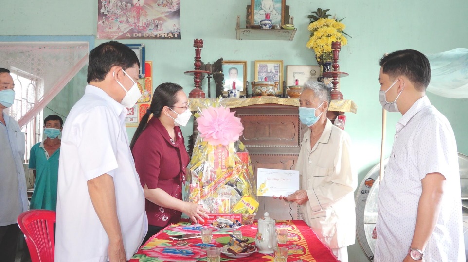 Tại các gia đình đến thăm, Chủ tịch Ủy ban MTTQ tỉnh Nguyễn Thị Hồng Nhung ân cần hỏi thăm sức khỏe, bày tỏ tình cảm, sự biết ơn sâu sắc đến người có công, gia đình chính sách và chúc các gia đình đón Tết Nguyên đán đầm ấm, yên vui, tặng mỗi gia đình một phần quà trị giá 01 triệu đồng và 01 triệu đồng tiền mặt.