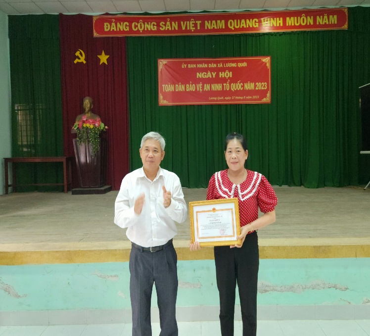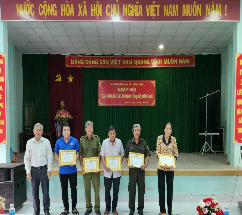 Hướng tới kỷ niệm 78 năm Ngày cách mạng Tháng Tám thành công và 18 năm Ngày hội toàn dân bảo vệ an ninh Tổ quốc, Ban Chỉ đạo phòng, chống tội phạm, tệ nạn xã hội và xây dựng phong trào toàn dân bảo vệ an ninh Tổ quốc xã Lương Quới tổ chức ngày hội “Toàn dân bảo vệ an ninh Tổ quốc” năm 2023. Đến tham dự có Đại úy Huỳnh Văn Tám - cán bộ Công an huyện; ông Nguyễn Minh Vũ - Phó Bí thư - Chủ tịch Ủy ban nhân dân xã; bà Trần Thị Út Tươi - Ủy viên Ban Thường vụ - Chủ tịch Ủy ban MTTQ Việt Nam xã cùng các đồng chí cấp ủy, ban ngành đoàn thể xã, chi ủy các chi bộ trực thuộc, đội dân phòng, đại diện Ban quản lý tổ Nhân dân tự quản, các cá nhân, tập thể được nhận khen thưởng.
