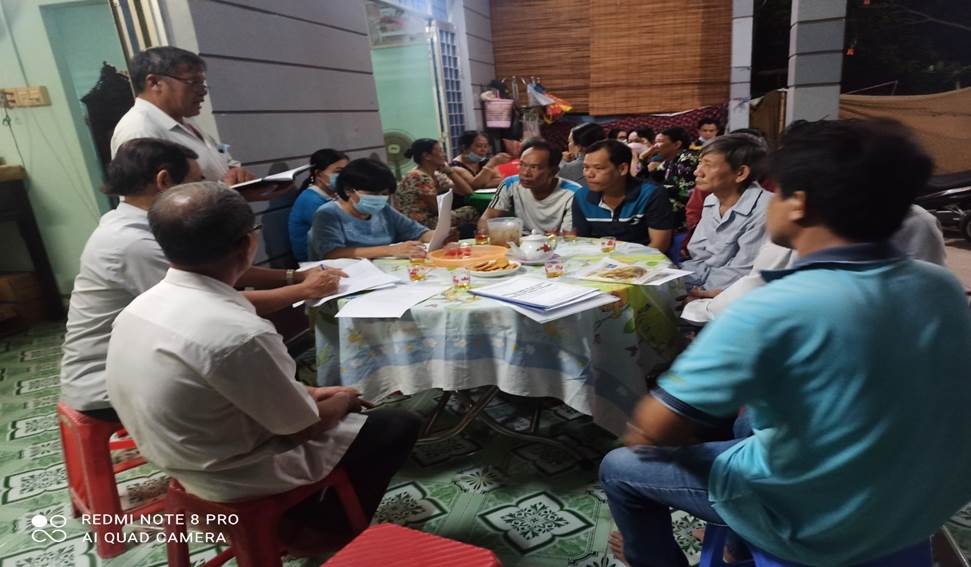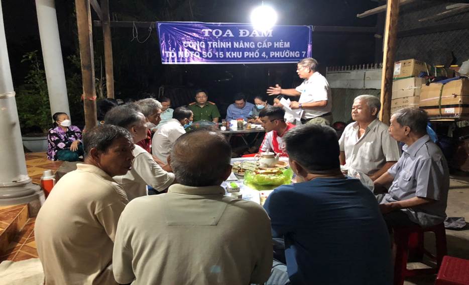 Quang cảnh buổi tọa đàm thống nhất chủ trương thực hiện công trình nâng cấp hẻm tổ NDTQ số 15 – Khu phố 4, Phường 7