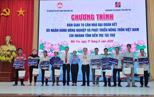 Ngày 17/6/2025, tại huyện Thạnh Phú, Ban Thường trực Ủy ban MTTQ Việt Nam tỉnh Bến Tre phối hợp cùng Ngân hàng Nông nghiệp và Phát triển nông thôn Việt Nam – Chi nhánh tỉnh Bến Tre (Agribank Bến Tre) tổ chức chương trình bàn giao 70 căn nhà đại đoàn kết cho các hộ gia đình có hoàn cảnh khó khăn về nhà ở trên địa bàn tỉnh.