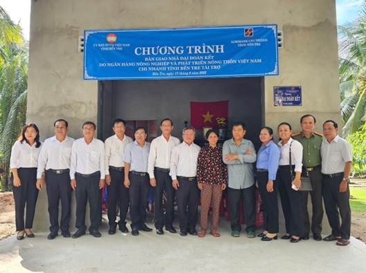 Theo báo cáo của Ủy ban MTTQ Việt Nam tỉnh, trong năm 2025, Agribank Bến Tre hỗ trợ xây dựng 70 căn nhà đại đoàn kết cho các hộ gia đình khó khăn về nhà ở của tỉnh Bến Tre, với tổng kinh phí hỗ trợ là 4,2 tỷ đồng (mỗi căn nhà trị giá 60 triệu đồng), được phân bổ đến các huyện, thành phố. Đây là hoạt động thiết thực trong chuỗi chương trình an sinh xã hội, vì người nghèo do Agribank Bến Tre đồng hành cùng Ủy ban MTTQ Việt Nam tỉnh thực hiện, đặc biệt là thực hiện chương trình xóa nhà tạm, nhà dột nát trên địa bàn tỉnh.