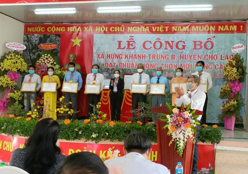 Năm 2019, Đảng bộ và Nhân dân xã Hưng Khánh Trung B đoàn kết xây dựng thành công xã đạt chuẩn nông thôn mới (NTM). Trên đà thắng lợi, tất cả tiếp tục xây dựng xã đạt chuẩn NTM nâng cao theo bộ tiêu chí xã NTM nâng cao. Với ý chí quyết tâm cao độ, tinh thần đoàn kết của cả hệ thống chính trị, ý thức người dân ngày càng nâng lên đến cuối năm 2021, Hưng Khánh Trung B một lần nữa được Ủy ban nhân dân tỉnh Bến Tre ra quyết định công nhận xã đạt chuẩn NTM nâng cao.
