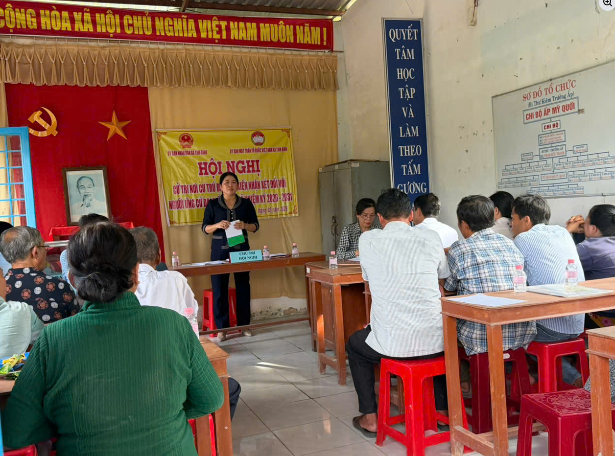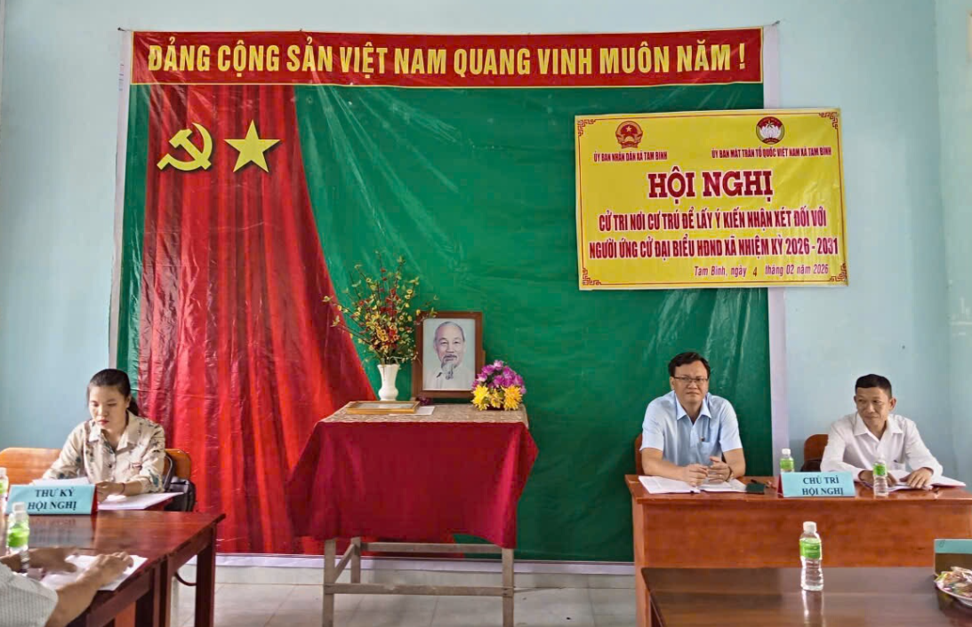 Ngày 04/02/2026, Ủy ban MTTQ Việt Nam xã Tam Bình phối hợp UBND xã triệu tập và chủ trì 09 điểm ở 09 ấp: Mỹ Trung 1, Mỹ Hưng, Tường Lễ, Mỹ Phú 5, Mỹ Phú 1, Mỹ Phú 2, Mỹ Phú 4, Mỹ Quới, Tường Nhơn B tổ chức hội nghị lấy ý kiến nhận xét và bày tỏ sự tín nhiệm của cử tri nơi cư trú với người ứng cử đại biểu HĐND xã, nhiệm kỳ 2026-2031.
