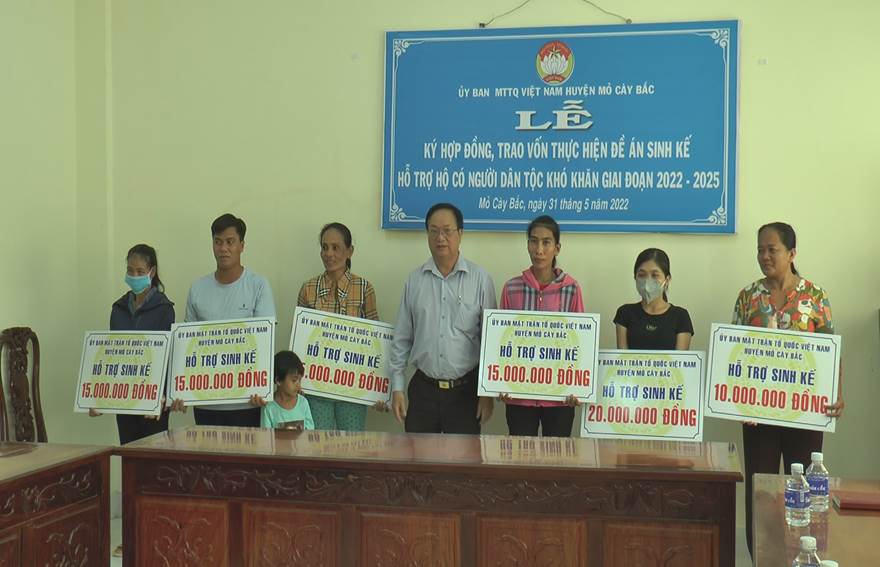 Huyện Mỏ Cày Bắc, hiện có 13 xã với 102 ấp; với 33.378 hộ; 131.374 nhân khẩu; phần lớn Nhân dân sống nghề nông nghiệp, một bộ phận đang chuyển đổi sang phát triển tiểu thủ công nghiệp, dịch vụ và thương mại. Trong đó, có 9/13 xã có người dân tộc, phần lớn các dân tộc gồm: Khmer, Nùng, Hoa, Thái, Giao, K’ho, Stieng, Ê đê, Tày; tổng số 94 hộ, với 200 nhân khẩu, (Nam 106, nữ: 86), có 21 người tham gia vào hội viên Hội nông dân, hội phụ nữ; 02 hộ nghèo, 05 hộ cận nghèo, hiện có 18 người đi làm ăn xa, các hộ nghèo, cận nghèo, hộ khó khăn, chủ yếu do thiếu vốn, thiếu phương tiện sản xuất.... Khảo sát thực tế các hộ nghèo, cận nghèo, hộ khó khăn phân tích tổng hợp nhu cầu của từng hộ, để đưa ra phương thức hỗ trợ phù hợp; đồng thời chọn những hộ có đủ điều kiện để hỗ trợ vốn. Đợt này, Ủy ban Mặt trận Tổ quốc Việt Nam huyện ký hợp đồng, trao vốn thực hiện sinh kế cho 06 hộ dân tộc có hoàn cảnh khó khăn ở 03 xã Phú Mỹ, Thạnh Ngãi và Nhuận Phú Tân, mỗi hộ được hỗ trợ từ 10 triệu đồng đến 20 triệu đồng để thực hiện mô hình chăn nuôi, sản xuất cây giống và buôn bán. Tổng số tiền hỗ trợ cho 6 hộ là 90 triệu đồng, từ nguồn Quỹ “Vì người nghèo” huyện Mỏ Cày Bắc, hình thức hỗ trợ và thu hồi vốn (không tín lãi suất suốt trong thời gian hỗ trợ). Mỗi hộ được hỗ trợ vốn tự chọn mua con giống, các xã sẽ chi trả tiền cho người bán với số tiền tương ứng hỗ trợ cho từng hộ, không gửi tiền trực tiếp cho các hộ mua con giống (riêng hộ mua bán và sản xuất cây con giống thì giao tiền trực tiếp cho hộ). Thời gian hỗ trợ kể từ lúc nhận vốn đến hết năm 2024, sau khi kết thúc thời gian hỗ trợ, các hộ có trách nhiệm hoàn vốn lại cho Quỹ “Vì người nghèo” huyện, Ban Quản lý mô hình sẽ thực hiện thanh lý hợp đồng.