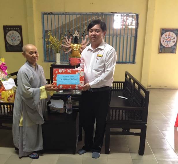 Đồng chí Nguyễn Vĩnh Phúc, CT UBMTTQ huyện tặng quà chúc mừng Ni trưởng Thích nữ Như Đán, Phó Trưởng Trị sự - Trưởng Phân ban Ni giới