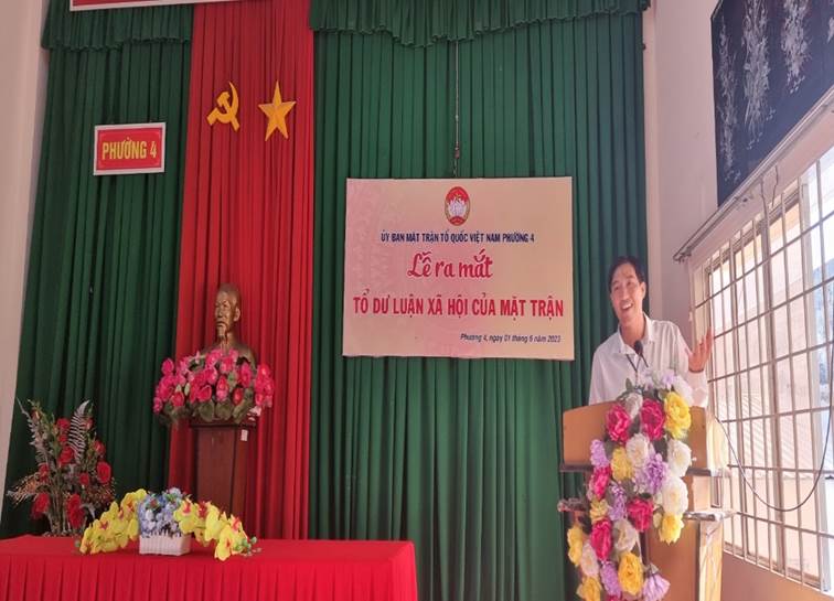 Được sự thống nhất của Đảng ủy, sáng ngày 01/6/2023, Ban Thường trực Ủy ban MTTQ Việt Nam Phường 4 đã tổ chức ra mắt “Tổ dư luận xã hội” của Mặt trận. Đến tham dự có bà Bùi Quang Kim Khanh - Ủy viên ban Thường trực Ủy ban MTTQ Việt Nam thành phố Bến Tre. Về phía lãnh đạo địa phương có ông Huỳnh Hoàng Nhựt, Phó Bí thư thư Đảng ủy, Chủ tịch HĐND; bà Bùi Xuân Phương, Chủ tịch Uỷ ban MTTQ Việt Nam Phường 4, bà Huỳnh Thị Tuyết Minh, Phó Chủ tịch Ủy ban nhân dân, cùng lãnh đạo các tổ chức thành viên và Ủy viên Ủy ban MTTQ Việt Nam phường; Bí thư Chi bộ, Trưởng khu phố; Ban công tác Mặt trận khu phố và các thành viên của Tổ dư luận xã hội.
