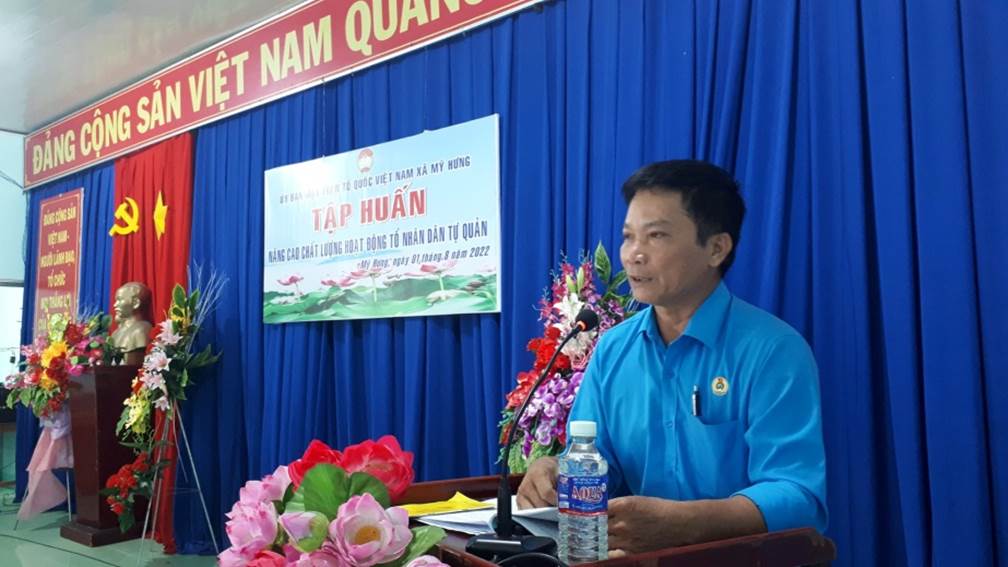 Ông Trần Hồ Bắc, Chủ tịch Ủy ban MTTQ Việt Nam xã Mỹ Hưng báo cáo một số nội dung trọng tâm của buổi tập huấn
