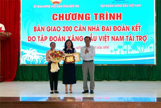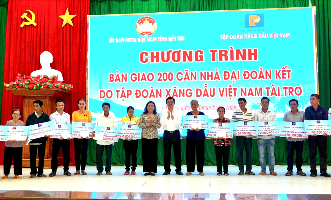 Chào mừng kỷ niệm 135 năm ngày sinh Chủ tịch Hồ Chí Minh và thực hiện chương trình xóa nhà tạm, nhà dột nát trên địa bàn tỉnh Bến Tre. Ngày 17/5/2025, Ban Thường trực Ủy ban MTTQ Việt Nam tỉnh Bến Tre phối hợp tổ chức chương trình bàn giao 200 nhà đại đoàn kết cho hộ nghèo khó khăn về nhà ở trên địa bàn tỉnh Bến Tre do Tập đoàn Xăng dầu Việt Nam tài trợ.
