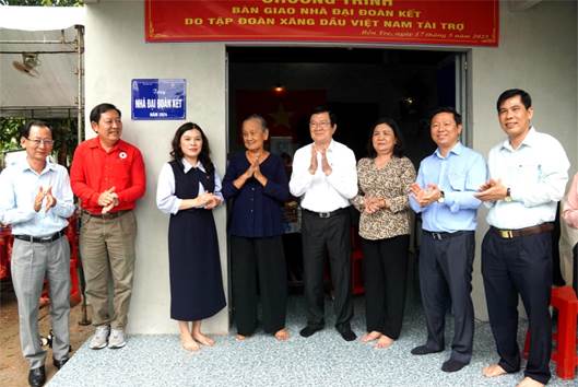Theo báo cáo của MTTQ Việt Nam tỉnh, năm 2024, được ông Trương Tấn Sang, nguyên Chủ tịch nước Cộng hòa xã hội chủ nghĩa Việt Nam vận động Tập đoàn Xăng dầu Việt Nam hỗ trợ kinh phí 10 tỷ đồng để xây dựng 200 căn nhà đại đoàn kết cho hộ nghèo, khó khăn về nhà ở trên địa bàn tỉnh Bến Tre, mỗi căn 50.000.000 đồng. Từ nguồn kinh phí và số lượng nhà được hỗ trợ, Ban Thường trực Ủy ban MTTQ Việt Nam tỉnh phối hợp với Công ty TNHH Một thành viên Xăng dầu Bến Tre phân bổ đến các huyện Giồng Trôm, Ba Tri, Bình Đại, Thạnh Phú và Chợ Lách.