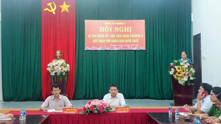 Ngày 22/8/2023, Đảng ủy phường 5 tổ chức Hội nghị đối thoại giữa người đứng đầu cấp uỷ, chính quyền với Nhân dân trên địa bàn phường năm 2023. Ông Phạm Văn Ninh, Bí thư Đảng ủy; ông Nguyễn Thanh Bằng, Chủ tịch UBND phường chủ trì hội nghị. Tham dự có các đồng chí trong Ban Thường vụ Đảng ủy, Thường trực HĐND; lãnh đạo: UBND, Ủy ban MTTQ Việt Nam và các tổ chức chính trị - xã hội; cán bộ công chức phường, bí thư chi bộ, trưởng khu phố và nhân dân trên địa bàn phường.