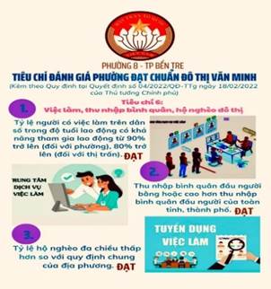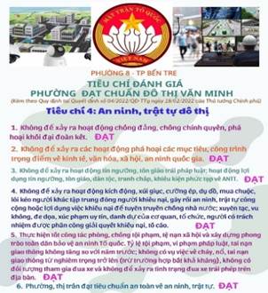 Trong thời gian qua, Ban chỉ đạo Phường 8 đã quan tâm lãnh đạo và Ban vận động 04 khu phố cùng phối hợp đồng bộ, phấn đấu thực hiện 9 tiêu chí với 52 nội dung, đến nay cơ bản đã hoàn thành 40/52 nội dung về phường đô thị văn minh.