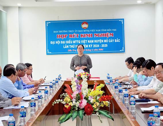Sau đại hội huyện điểm của tỉnh (huyện Mỏ Cày Bắc vào ngày 09/4/2024), ngày 12/4/2024, Ban Thường trực Ủy ban MTTQ Việt Nam tỉnh tổ chức cuộc họp rút kinh nghiệm Đại hội đại biểu MTTQ Việt Nam huyện Mỏ Cày Bắc lần thứ IV, nhiệm kỳ 2024-2029. Chủ tịch Ủy ban MTTQ Việt Nam tỉnh Nguyễn Thị Hồng Nhung chủ trì hội nghị.
