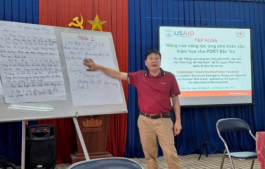 Từ ngày 30/5 đến ngày 02/6/2023, tại hội trường tỉnh Hội, Hội Chữ thập đỏ tỉnh Bến Tre phối hợp với Trung ương Hội Chữ thập đỏ Việt Nam tổ chức lớp tập huấn nâng cao năng lực ứng phó khẩn cấp cho Đội ứng phó thiên tai, thảm họa cấp tỉnh (PDRT) năm 2023 trong khuôn khổ dự án do Cơ quan Phát triển Quốc tế Hoa Kỳ tài trợ.