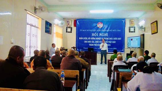 Sáng ngày 24/8/2024, Ban Thường trực Ủy ban MTTQ Việt Nam thành phố Bến Tre phối hợp với Công an thành phố cùng Ban Trị sự Giáo hội Phật giáo Việt Nam thành phố tổ chức Hội nghị huấn luyện, bồi dưỡng nghiệp vụ phòng cháy chữa cháy dành cho chức sắc, chức việc, tín đồ Phật giáo năm 2024 tại chùa Bạch Vân (phường 6, thành phố Bến Tre).
