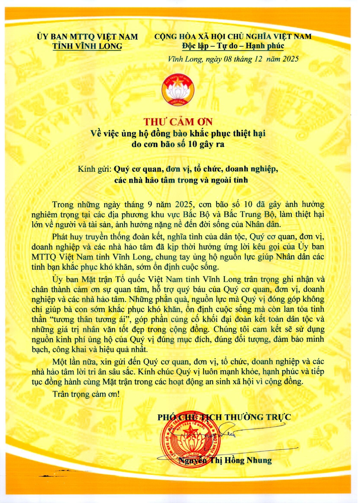 Thư cảm ơn: Về việc ủng hộ đồng bào khắc phục thiệt hại do cơn bão số 10 gây ra