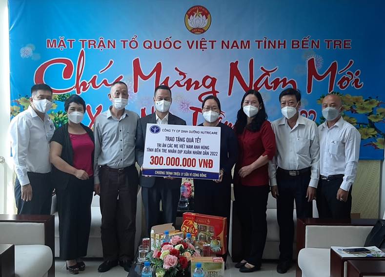 Sáng ngày 13/01/2022, Ủy ban Mặt trận Tổ quốc Việt Nam tỉnh Bến Tre tổ chức chương trình tiếp nhận kinh phí hỗ trợ quà cho Mẹ Việt Nam anh hùng trên địa bàn tỉnh Bến Tre nhân dịp Tết Nguyên đán Nhâm Dần năm 2022 do Công ty Cổ phần Dinh dưỡng Nutricare tài trợ. Tham dự buổi tiếp nhận có bà Nguyễn Thị Bé Mười, Phó Chủ tịch UBND tỉnh; bà Nguyễn Thị Hồng Nhung, Chủ tịch Ủy ban Mặt trận Tổ quốc Việt Nam tỉnh; ông Phạm Thanh Hùng, Giám đốc Sở Lao động, Thương binh và Xã hội tỉnh, ông Nguyễn Đức Minh, Tổng Giám đốc Công ty Cổ phần Dinh dưỡng Nutricare.