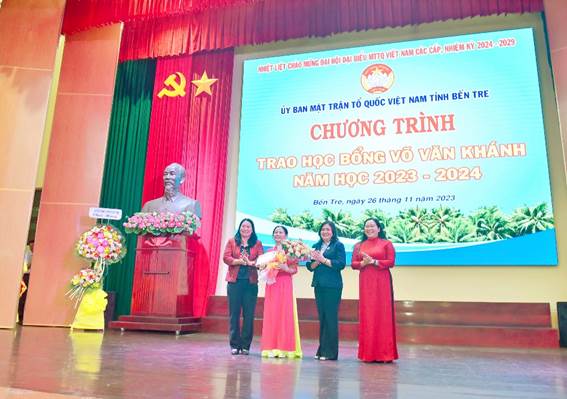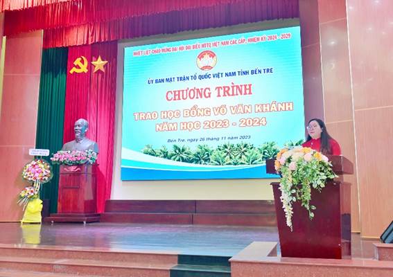 Phát biểu tại chương trình, Chủ tịch Ủy ban MTTQ Việt Nam tỉnh Nguyễn Thị Hồng Nhung, Trưởng Ban điều hành học bổng Võ Văn Khánh đã nêu ý nghĩa của học bổng Võ Văn Khánh và động viên tinh thần cho các em học sinh, sinh viên tiếp tục phấn đấu trong học tập và trở thành con ngoan trò giỏi. Trong đó nhấn mạnh: Cố Bí thư Tỉnh ủy Bến Tre Võ Văn Khánh và gia đình đã có nhiều tâm huyết chăm lo cho thế hệ trẻ và tên ông được lãnh đạo tỉnh nhà, Ủy ban MTTQ Việt Nam tỉnh và gia đình thống nhất đặt tên cho quỹ học bổng từ năm học 2012-2013 tại Bến Tre, do Ban Thường trực Ủy ban MTTQ Việt Nam tỉnh chủ trì với nguồn tài trợ từ gia đình ông. Năm học 2023-2024 là năm thứ 11 được gia đình Cố Bí thư Tỉnh ủy Bến Tre Võ Văn Khánh tiếp tục tài trợ để trao học bổng cho các em học sinh, sinh viên có hoàn cảnh khó khăn. Mỗi suất học bổng mà các em được nhận hôm nay mang ý nghĩa thật sự to lớn, các em và gia đình luôn được xã hội quan tâm, đồng hành trên bước đường đi tới tương lai, mong muốn sau này các em sẽ thành đạt và giúp ích cho xã hội.
