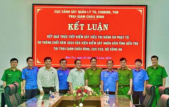 Thực hiện Quyết định số 417/QĐ-VKSBT-P8 ngày 08/10/2024 của Viện KSND tỉnh Bến Tre; từ ngày 21/10 đến ngày 01/11/2024, Viện kiểm sát nhân dân tỉnh Bến Tre đã tiến hành trực tiếp kiểm sát việc thi hành án phạt tù đối với Trại giam Châu Bình – Cục C10, Bộ Công an đợt 6 tháng cuối năm 2024. Đoàn kiểm sát do ông Bùi Văn Đằng, Phó Viện trưởng Viện KSND tỉnh làm Trưởng đoàn cùng với sự tham gia phối hợp, giám sát của ông Nguyễn Hải Hà, Phó Chủ tịch UBMTTQVN tỉnh Bến Tre và ông Nguyễn Minh Triều, Phó Trưởng Ban Pháp chế HĐND tỉnh Bến Tre.