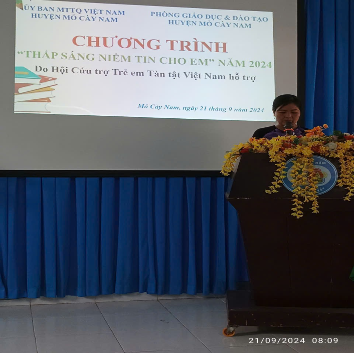 Chương trình “Thắp sáng niềm tin cho em” nhằm vận động tặng quà, học bổng, cho trẻ em khuyết tật có hoàn cảnh khó khăn, đặc biệt, tiêu biểu vượt khó vươn lên trong cuộc sống và học tập của huyện nhà. Mỗi suất gồm 01 phần quà và tiền mặt là 1.000.000 đồng nhằm động viên, khích lệ các em vươn lên trong năm học mới. Tổng kinh phí 12.000.000 đồng do Hội Cứu trợ Trẻ em tàn tật Việt Nam hỗ trợ thông qua Ban vận động quỹ “Vì người nghèo” Ủy ban MTTQ Việt Nam tỉnh Bến Tre.