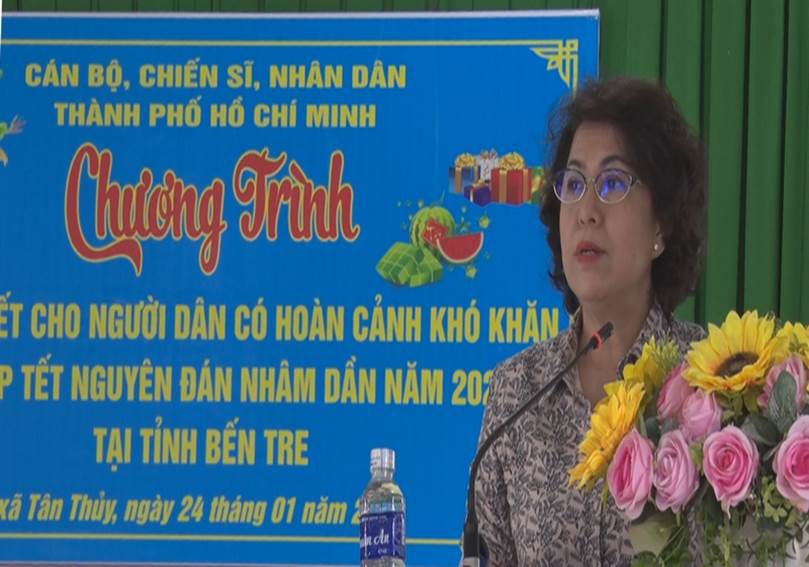 Phát biểu tại buổi lễ, bà Tô Thị Bích Châu, Chủ tịch Ủy ban MTTQ Việt Nam Thành phố Hồ Chí Minh bày tỏ mong muốn góp sức cùng quê hương chăm lo để người dân có hoàn cảnh khó khăn được một cái Tết đầm ấm và thực hiện tốt công tác phòng, chống dịch bệnh cho người dân.