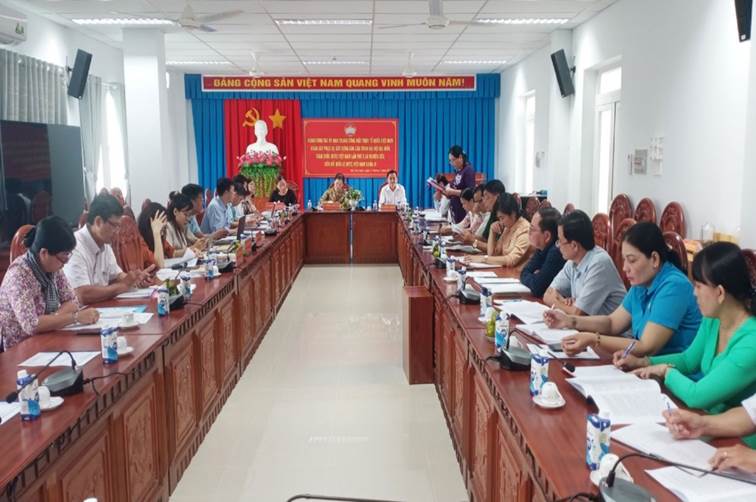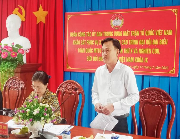 Báo cáo với đoàn công tác, Chủ tịch Ủy ban MTTQ huyện Châu Văn Bảy cho biết: “Trong nhiệm kỳ, mặc dù còn nhiều khó khăn, nhưng hệ thống Mặt trận từ huyện đến cơ sở đã xác định rõ vị trí, vai trò của mình trong thực hiện đường lối, chủ trương của Đảng, chính sách, pháp luật của Nhà nước; nhất là thực hiện chủ đề “Phát huy dân chủ, tăng cường đồng thuận xã hội, củng cố vững chắc khối đại đoàn kết toàn dân tộc vì sự phát triển toàn diện của huyện Mỏ Cày Nam. Mặt trận Tổ quốc đã phát huy vị trí, vai trò quan trọng của mình trong hệ thống chính trị, tiên phong trong các phong trào hành động cách mạng, phong trào thi đua yêu nước, tham gia xây dựng Đảng, chính quyền; đẩy mạnh công tác tuyên truyền, tập hợp, vận động nhân dân đồng thuận, tích cực hưởng ứng bằng những việc làm, hành động thiết thực, cụ thể và hiệu quả,…từ đó, góp phần quan trọng trong thực hiện nhiệm vụ phát triển kinh tế - xã hội, giữ vững quốc phòng - an ninh".