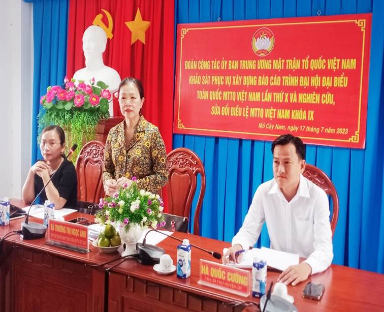 Sáng ngày 17/7/2023, Phó Chủ tịch Ủy ban Trung ương MTTQ Việt Nam Trương Thị Ngọc Ánh cùng đoàn công tác có buổi làm việc với huyện Mỏ Cày Nam nhằm khảo sát phục vụ xây dựng báo cáo trình Đại hội đại biểu toàn quốc lần thứ X và nghiên cứu, sửa đổi điều lệ MTTQ Việt Nam lần thứ IX. Cùng tham dự có Phó Chủ tịch Ủy ban MTTQ Việt Nam tỉnh Nguyễn Thị Mai Rý. Bí thư Huyện ủy Hà Quốc Cường; Chủ tịch Ủy ban MTTQ huyện Châu Văn Bảy tiếp và làm việc với đoàn.