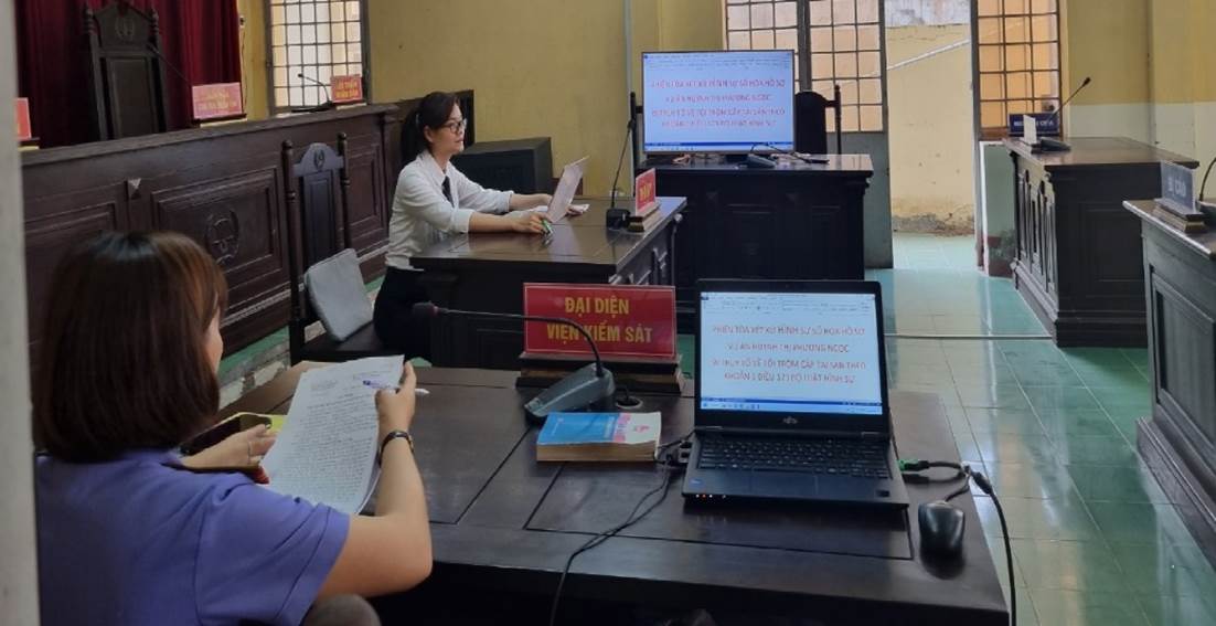 Thực hiện kế hoạch công tác kiểm sát năm 2023 với nhiệm vụ đột phá ứng dụng công nghệ thông tin và chuyển đổi số trong ngành. Để thực hiện tốt nhiệm vụ này, Lãnh đạo Viện đã chỉ đạo phối hợp với Tòa án cùng cấp tổ chức thực hiện “số hóa hồ sơ”, trình chiếu, công khai tài liệu, chứng cứ của Kiểm sát viên khi thực hành quyền công tố, kiểm sát xét xử tại phiên tòa sơ thẩm vụ án hình sự. Ngày 28/3/2023, Viện kiểm sát nhân dân huyện Châu Thành phối hợp với Tòa án nhân dân huyện chọn phiên tòa xét xử hình sự, đối với bị cáo Huỳnh Thị Phương Ngọc bị truy tố về tội trộm cắp tài sản theo khoản 1 Điều 173 Bộ luật Hình sự năm 2015, sửa đổi bổ sung năm 2017 thông qua việc “số hóa hồ sơ” để Kiểm sát viên trình chiếu, công khai tài liệu, chứng cứ tại phiên tòa trong quá trình thực hành quyền công tố, kiểm sát xét xử vụ án hình sự.