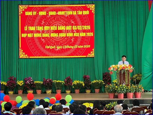 Nhân kỷ niệm 96 năm thành lập Đảng Cộng sản Việt Nam (03/02/1930 - 03/02/2026), mừng Xuân Bính Ngọ 2026, sáng ngày 03/02/2026, Đảng ủy, HĐND, UBND, UBMTTQ Việt Nam xã Tân Quới trang trọng tổ chức lễ trao Huy hiệu Đảng đợt 03/02 cho các đồng chí cao niên tuổi Đảng và họp mặt mừng Đảng, mừng Xuân Bính Ngọ năm 2026.