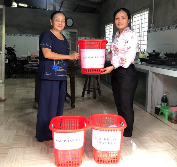 Bà Lê Thị Kim Quyên, PCT.MTTQVN xã trao sọt rác tại hộ cho gia đình đăng ký thực hiện mô hình
