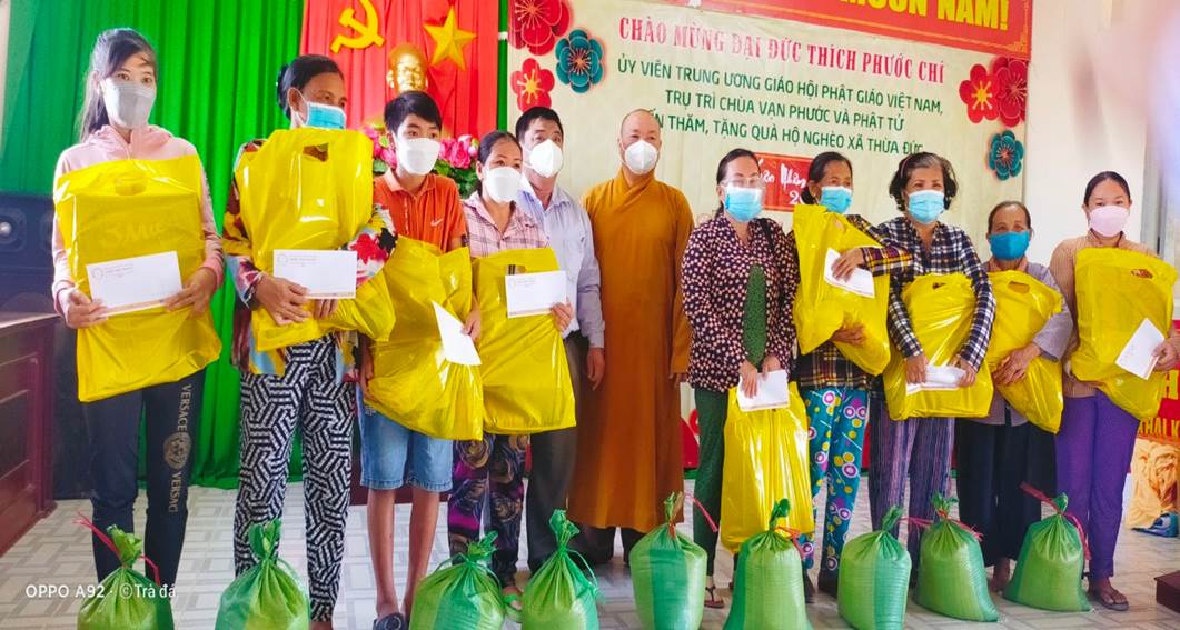 Ngày 22 tháng 01 năm 2022, tại xã Thừa Đức, Ban Thường trực Ủy ban Mặt trận Tổ quốc Việt Nam huyện Bình Đại phối hợp Chùa Vạn Phước trao tặng 105 phần quà cho các hộ nghèo có hoàn cảnh khó khăn trên địa bàn xã nhân dịp tết Nguyên đán Nhâm Dần 2022. Tham dự buổi trao quà có Ông Trần Văn Phục, Chủ tịch Ủy ban Mặt trận Tổ quốc Việt Nam huyện Bình Đại; Đại Đức Thích Phước Chí, Ủy viên Trung ương giáo hội phật giáo Việt Nam, Trụ trì Chùa Vạn Phước và các sư thầy cùng đi, ông Phạm Hữu Hoàng, Chủ tịch Ủy ban Mặt trận Tổ quốc Việt Nam xã, ông Phạm Văn Sang, Phó chủ tịch UBND xã. Đây là 01 trong những xã điều kiện kinh tế khó khăn nhất của huyện, tỷ lệ hộ nghèo còn cao, người dân sống chủ yếu bằng nghề làm thuê, đặc biệt trong tình hình đại dịch Covid-19 diễn biến phức tạp, người dân càng khó khăn hơn nhất là các hộ nghèo không có đủ điều kiện để vui xuân đón tết.